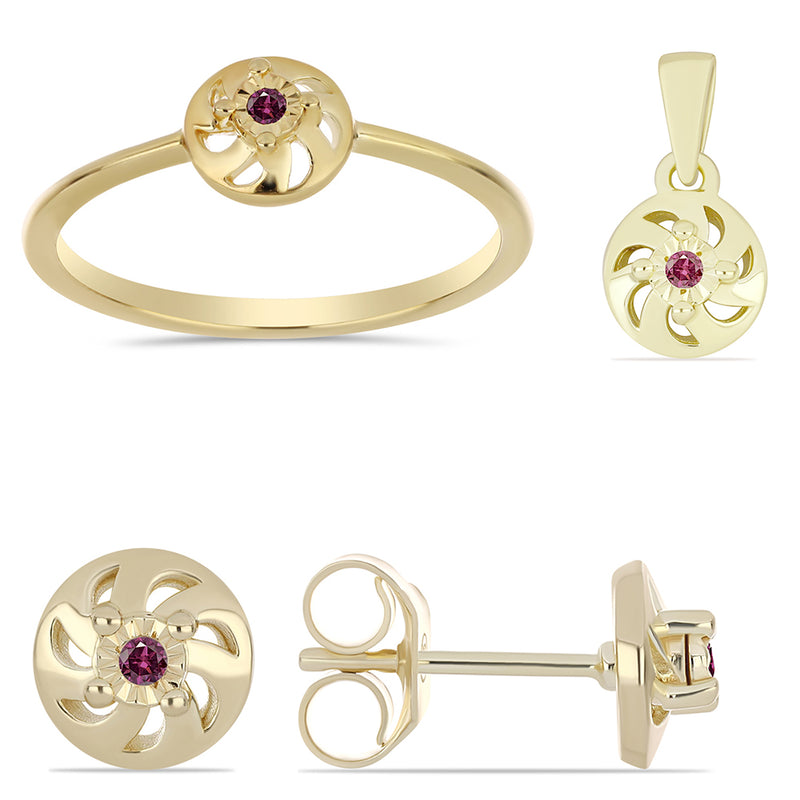 Pozlacená Stříbrná Sada s Purpurovým Diamantem ( Náušnice+Prsten+Přívěsek )