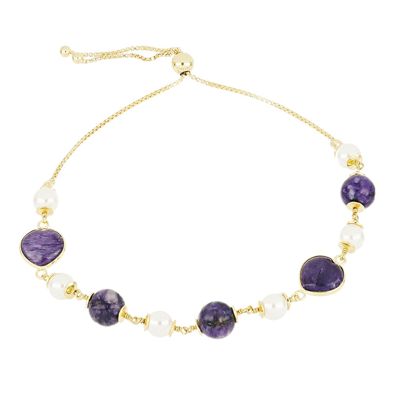 Pozlacený Stříbrný Náramek s Čaroitem a Bílou Sladkovodní Perlou