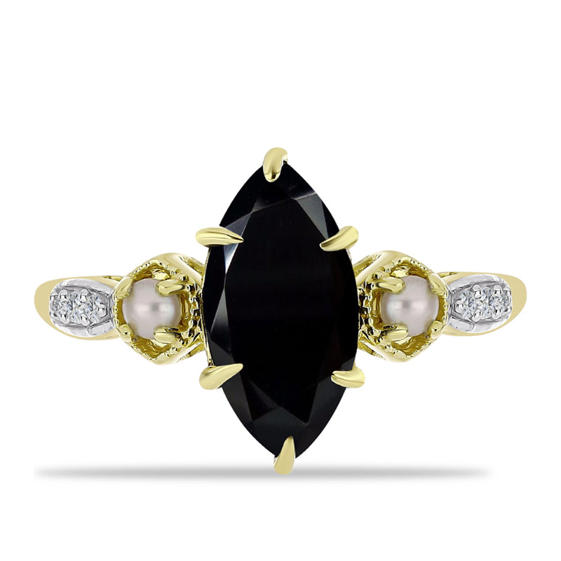 Pozlacený Stříbrný Prsten s Černým Suwarským Onyxem a Bílou Sladkovodní Perlou