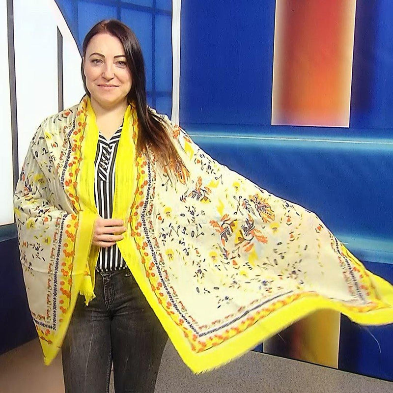 Šála-šátek, 90 cm x 180 cm, Světlý lidový květinový vzor, žlutá