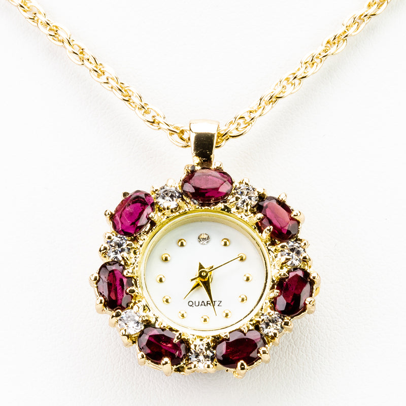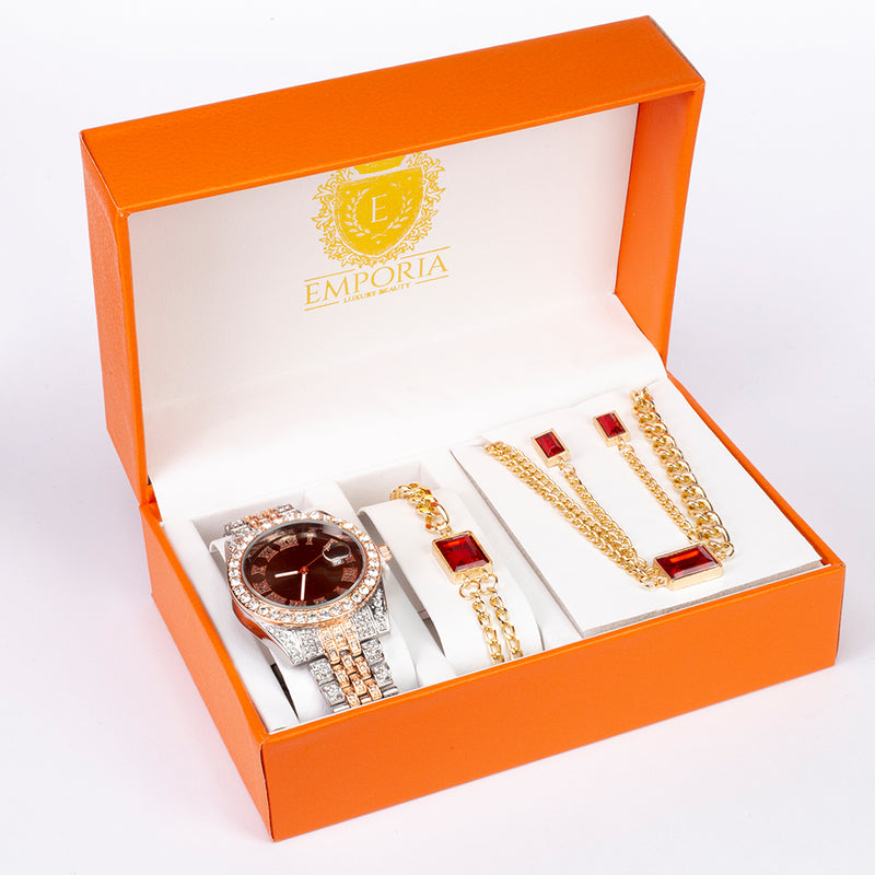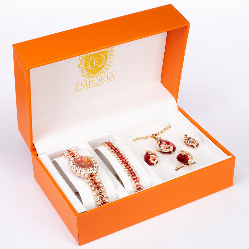 Pozlacený Slitinový Hodinky s Červeným Emporia® Křišťálem (Náhrdelník+Náušnice+Náramek+Přívěsek)