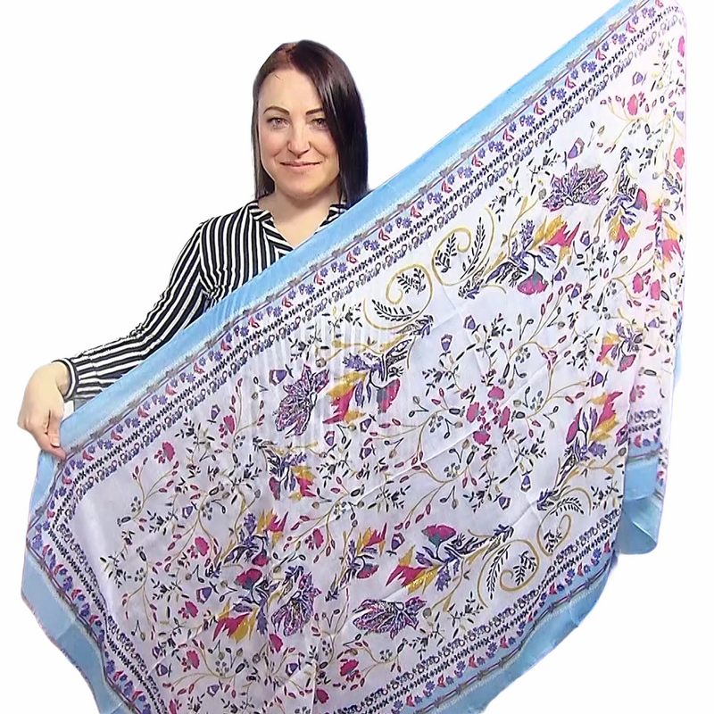 Šála-šátek, 90 cm x 180 cm, Světlý lidový květinový vzor, modrá