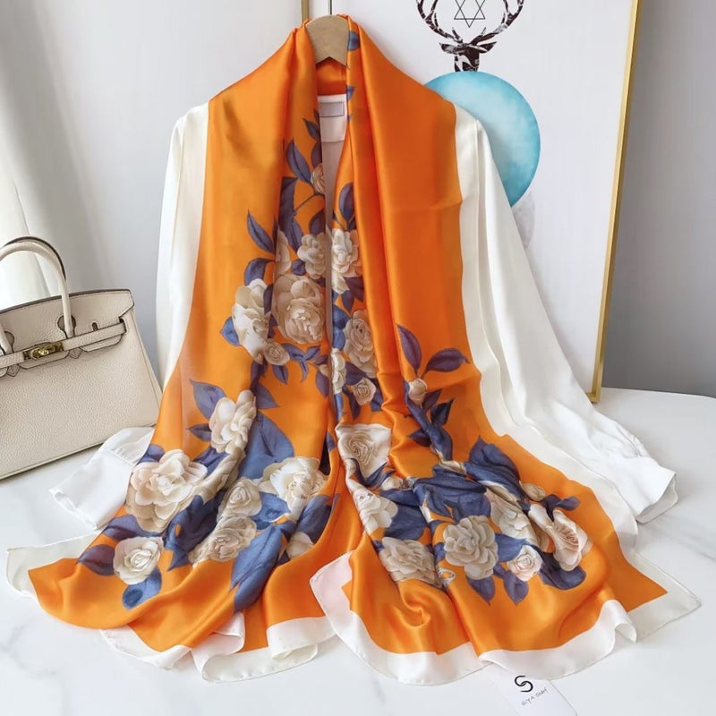 Hedvábný šátek, 90 cm x 180 cm, Květina opravdové lásky, oranžová barva, 100% hedvábí