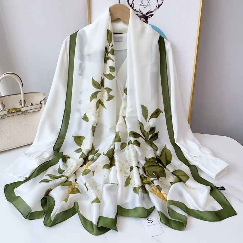 Hedvábný šátek, 90 cm x 180 cm, Květina opravdové lásky, zelená, 100% hedvábí