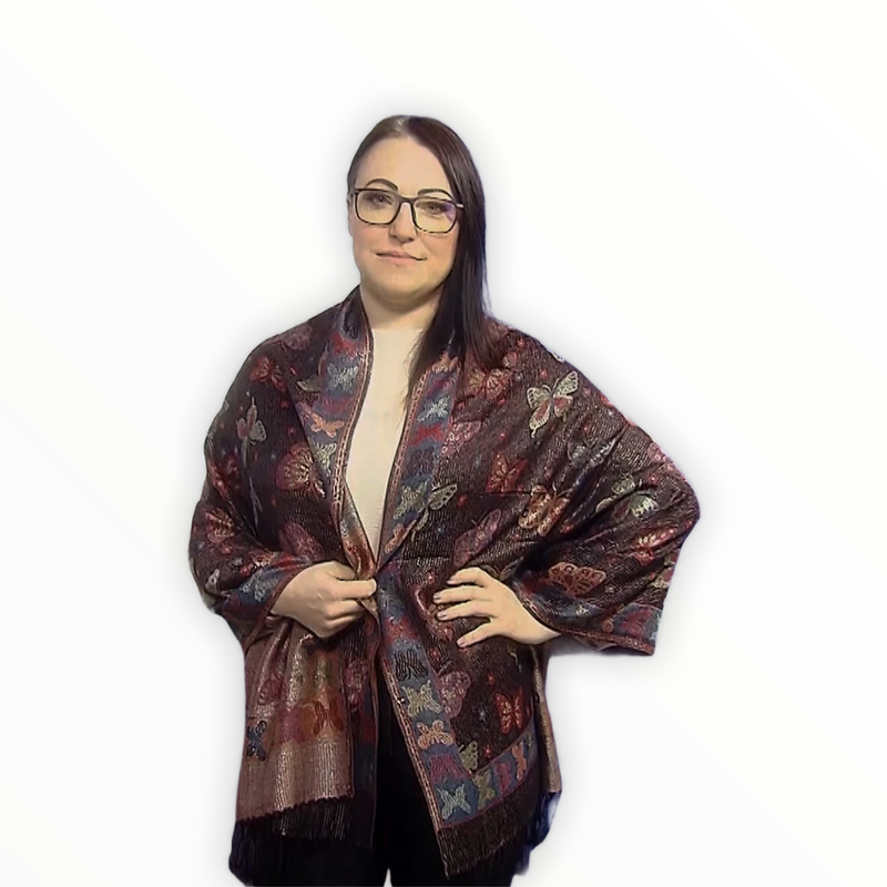 Šála-šátek ze 100% Pravého Pashmina Kašmíru, 70 cm x 170 cm, Lesklá černá s motýlím vzorem