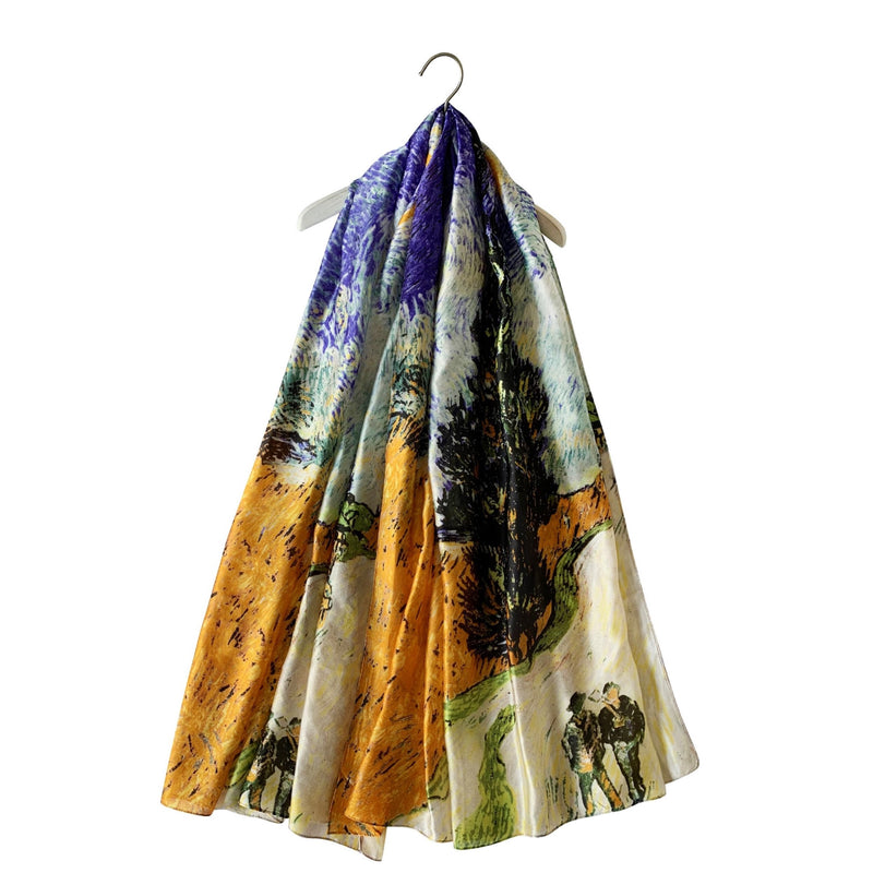 100% Hedvábná Šála, 90 cm x 180 cm, Van Gogh Cypřiš a Hvězda