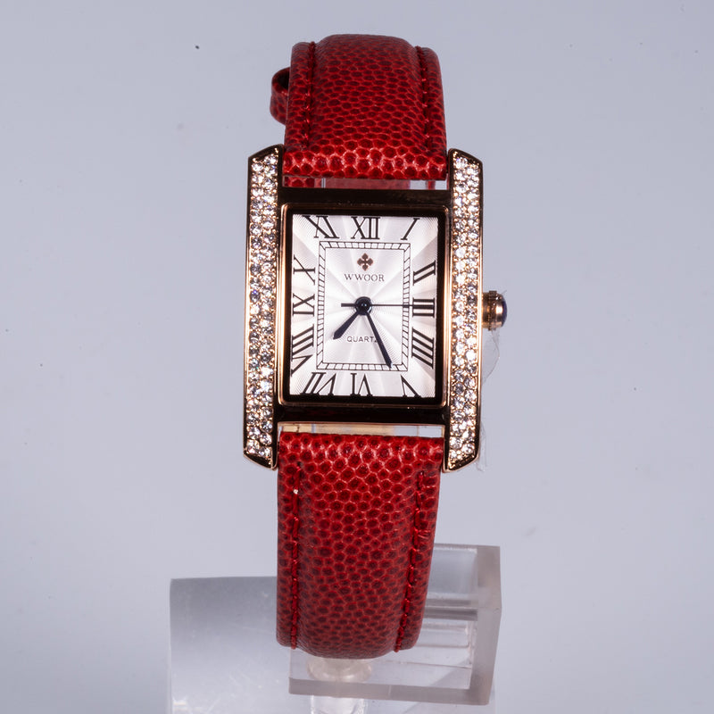 Hodinky z Ušlechtilé Oceli s Červeným Koženým Řemínkem, Bílým Ciferníkem a Zirkonem