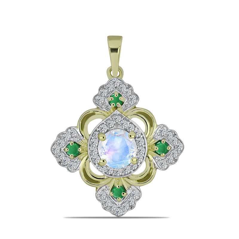 Pozlacený Stříbrný Přívěsek s Duhovým Měsíčním Kamenem a Brazilským Smaragdem