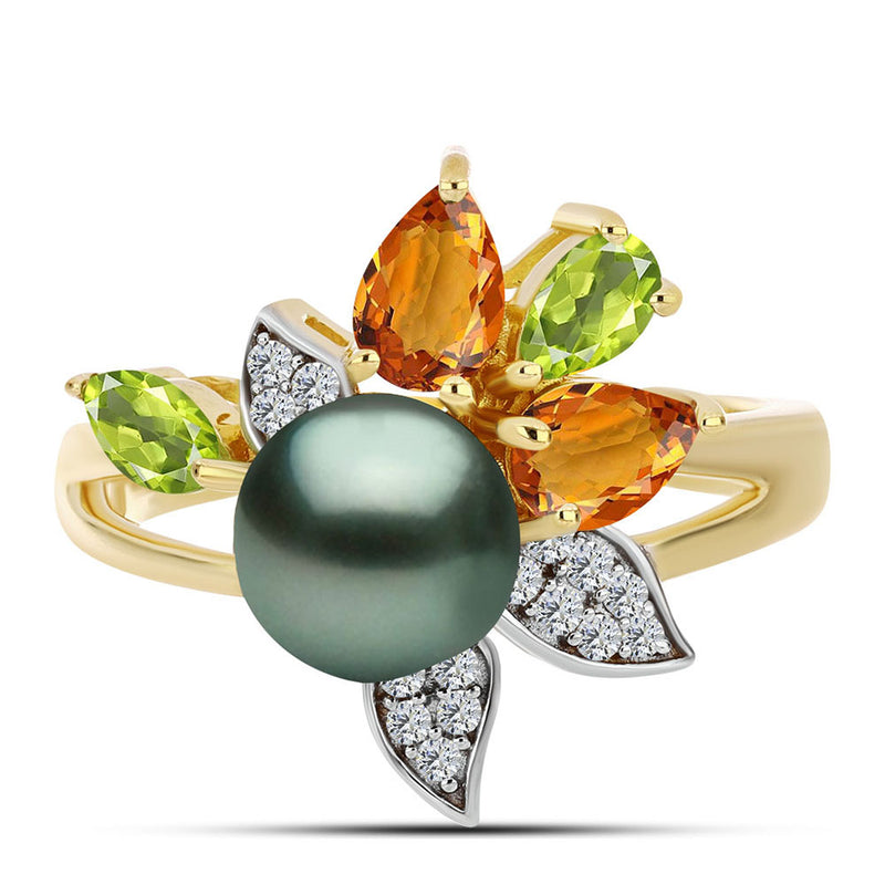 Pozlacený Stříbrný Prsten se Sladkovodní perlou v podobě Tahitské zelené iluze a Uralským Citrínem