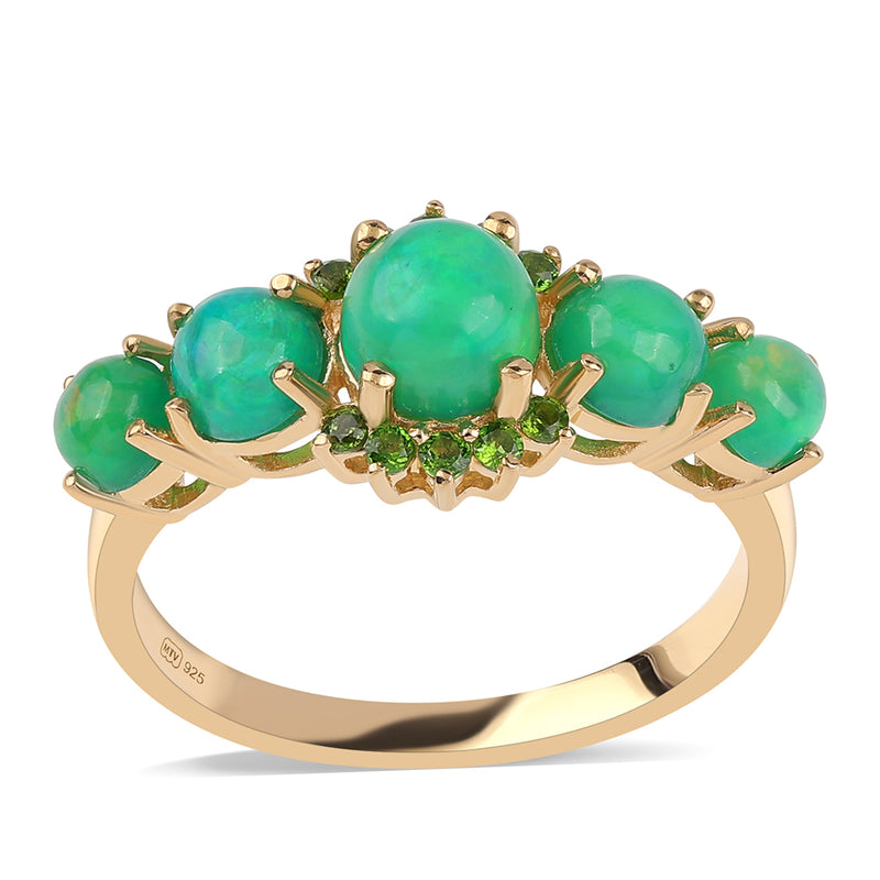 Pozlacený Stříbrný Prsten se Zeleným Etiopským Opálem z Lega Dembi a Chromovým Diopsidem