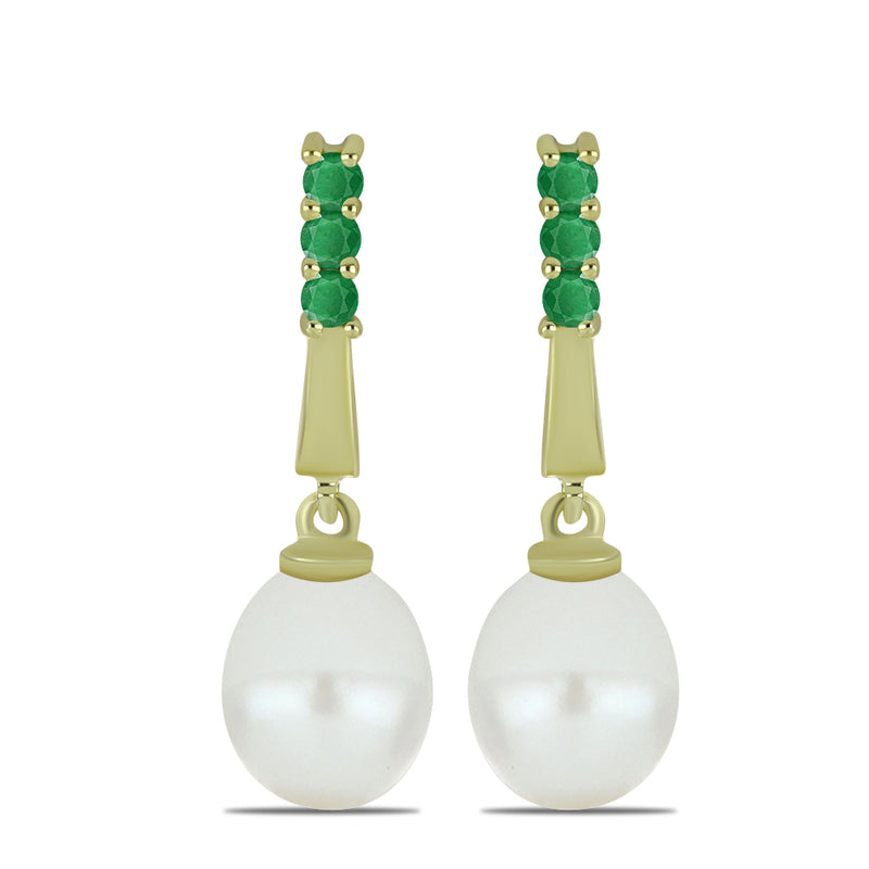 Pozlacené Stříbrné Náušnice s Bílou Sladkovodní Perlou a Brazilským Smaragdem