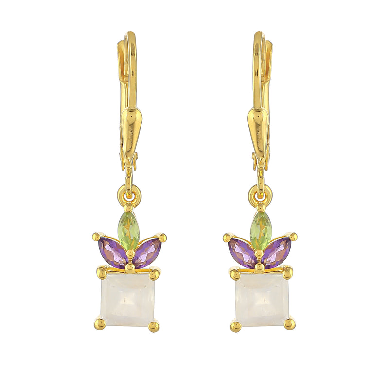 Pozlacené Stříbrné Náušnice s Duhovým Měsíčním Kamenem a Brazilským Ametystem