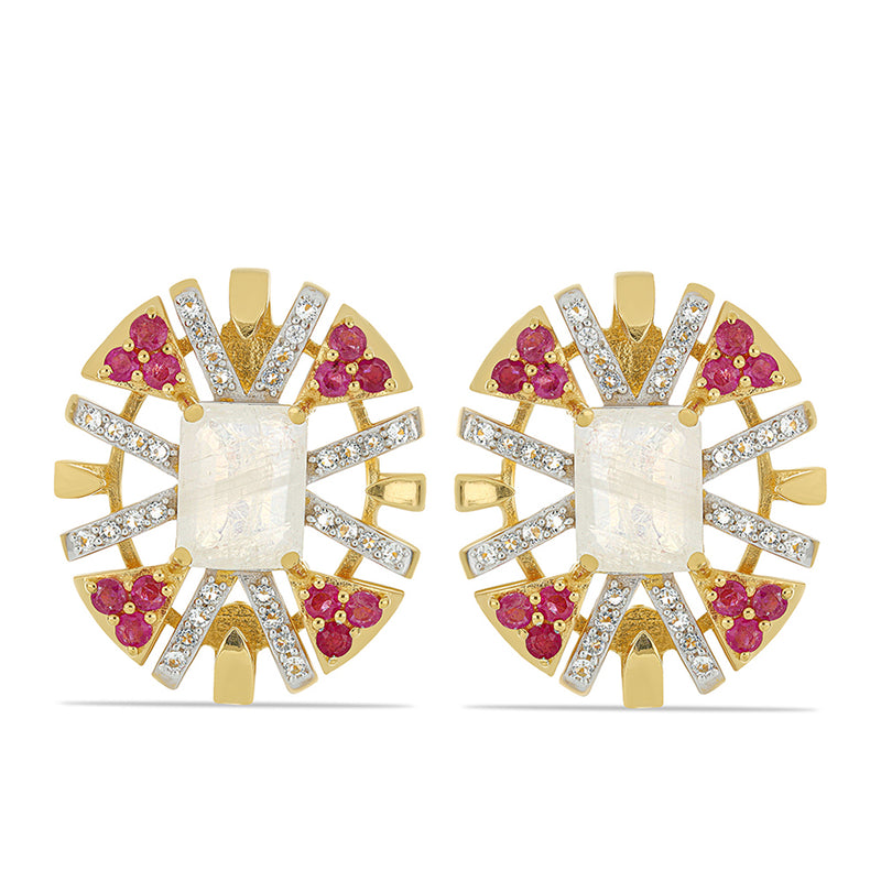 Pozlacené Stříbrné Náušnice s Duhovým Měsíčním Kamenem a Madagaskarským Rubínem