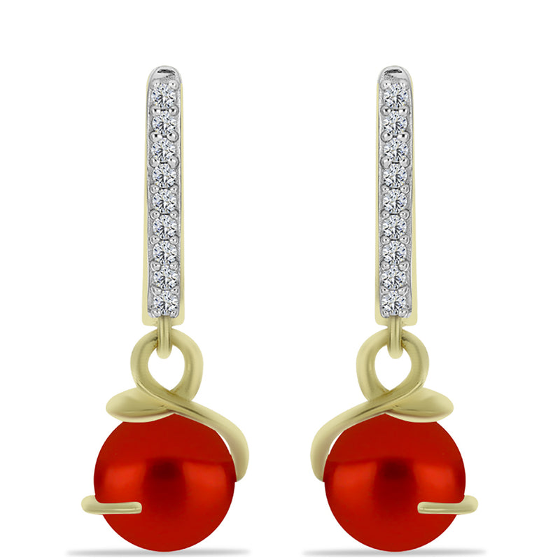 Pozlacené Stříbrné Náušnice s Červená sladkovodní Perlou a Bílým Topazem