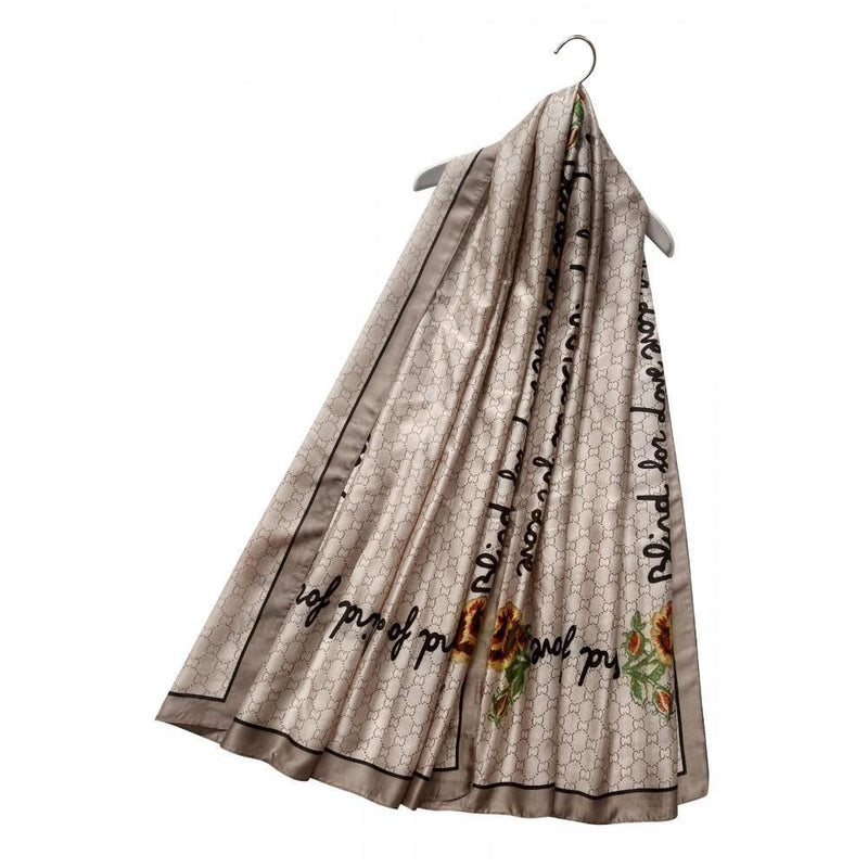 Hedvábná šála-šátek, 90 cm x 180 cm, s ozdobným textem, béžová