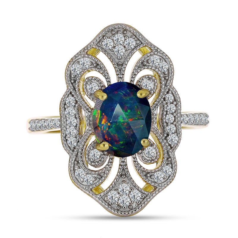 Pozlacený Stříbrný Prsten s Půlnočně Černým Etiopským Opálem z Lega Dembi a Bílým Topazem