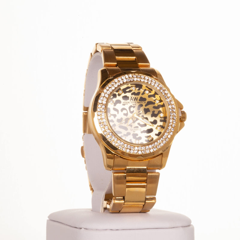 AW dámské hodinky ve zlaté barvě, s ciferníkem v leopardím vzoru a s krystaly křemenu
