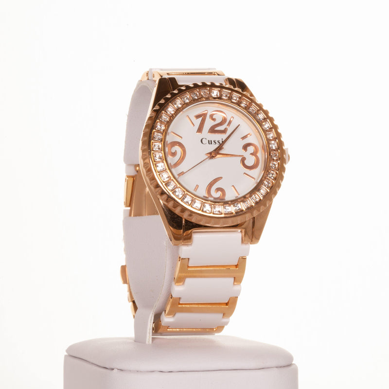 CUSSI dámské hodinky v barvě růžového zlata s bílým řemínkem a krystaly křemene kolem ciferníku