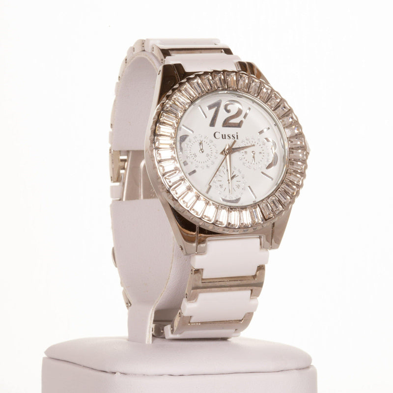 CUSSI dámské hodinky ve stříbrné barvě s bílým řemínkem a s krystaly křemenu kolem ciferníku
