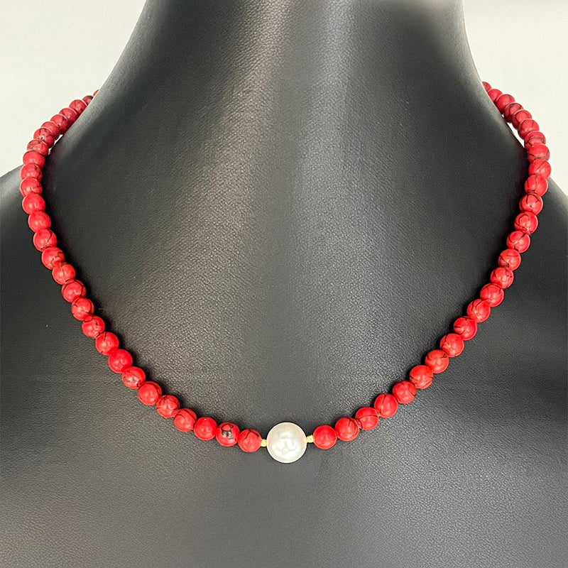 Pozlacený Stříbrný Náhrdelník s Červeným Houbovým Korálem a se Skleněná Perla