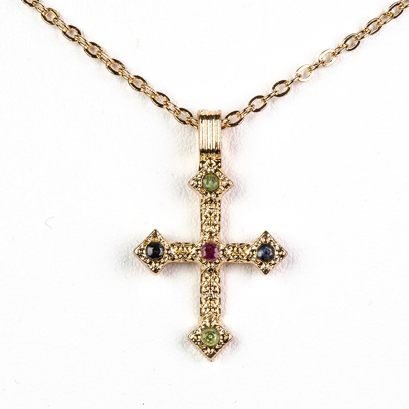 Kříž Pozlacený Slitinový Náhrdelník s Barmským Rubínem a Brazilským Smaragdem ( Náhrdelník+Přívěsek )