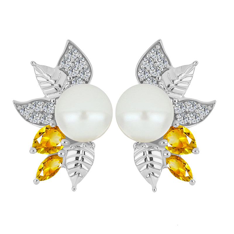 Stříbrné Náušnice s Uralským Citrínem a Bílou Sladkovodní Perlou