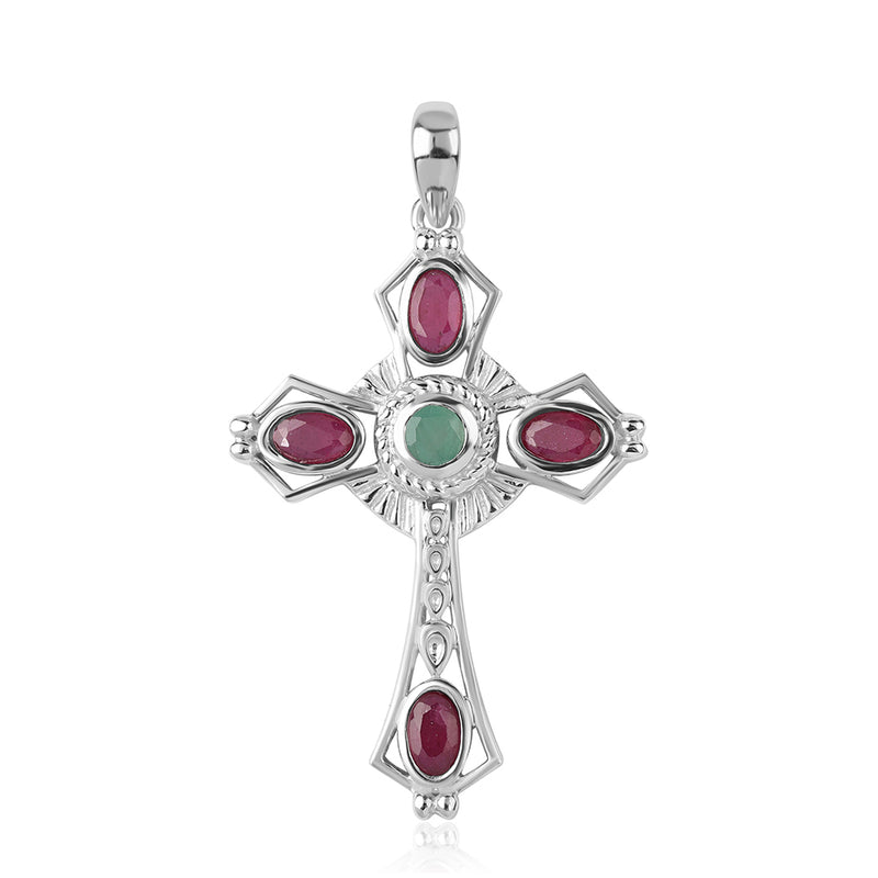 Kříž Stříbrný Přívěsek s Brazilským Smaragdem a Mozambickým Rubínem