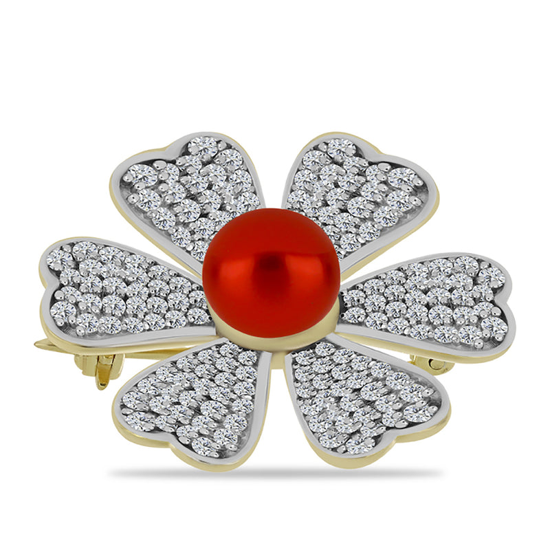 Pozlacený Stříbrný Brož s Červená sladkovodní Perlou a Bílým Topazem