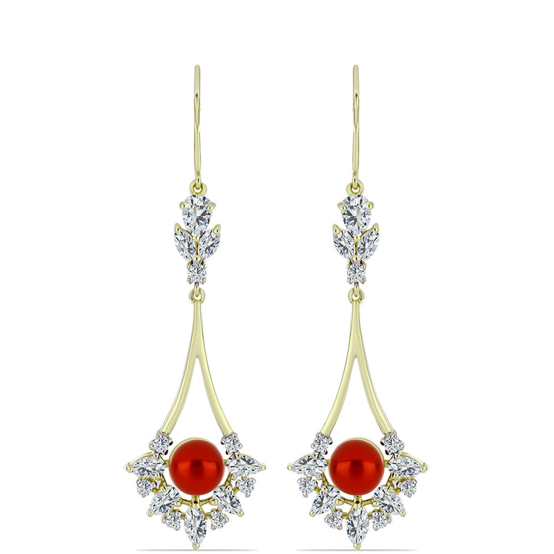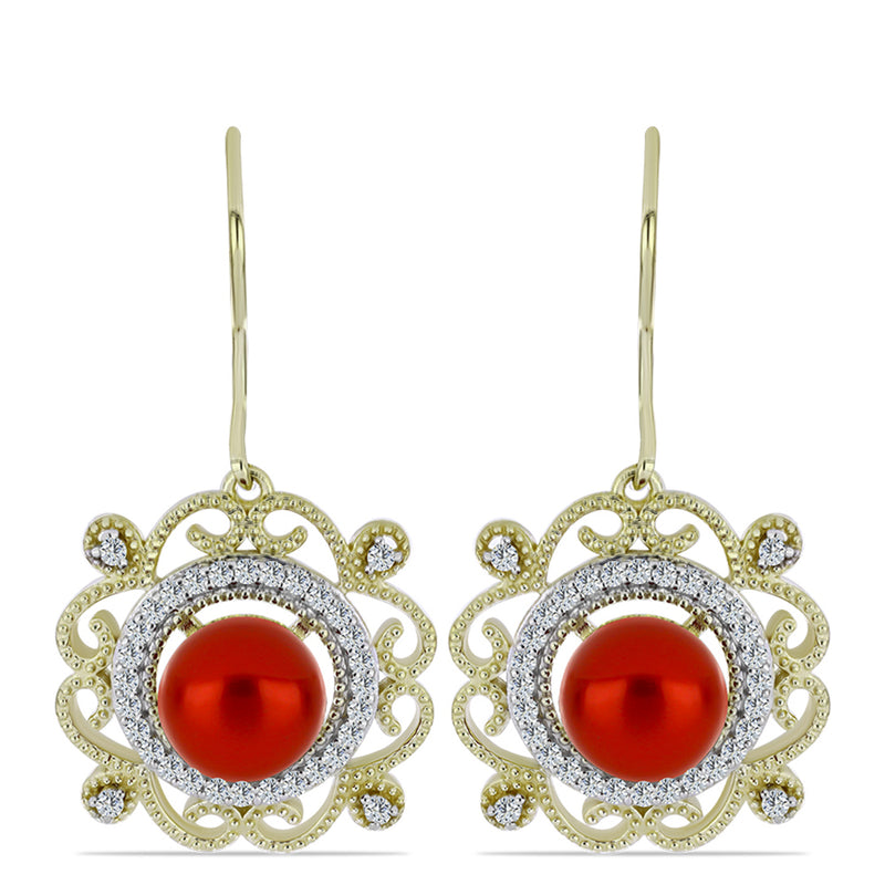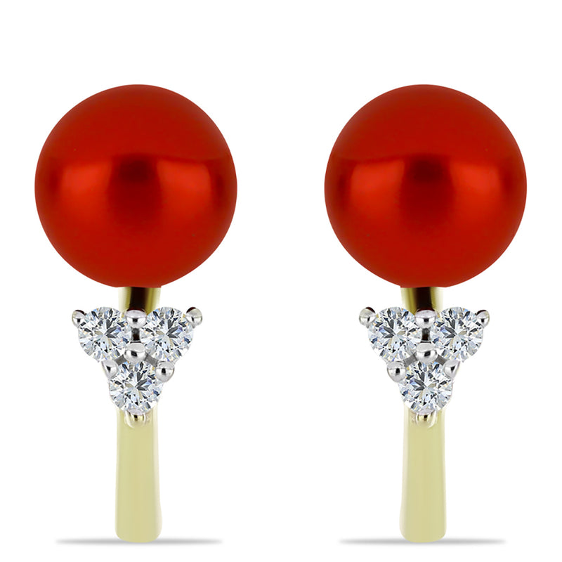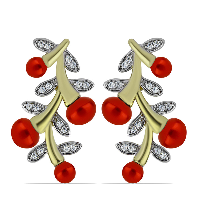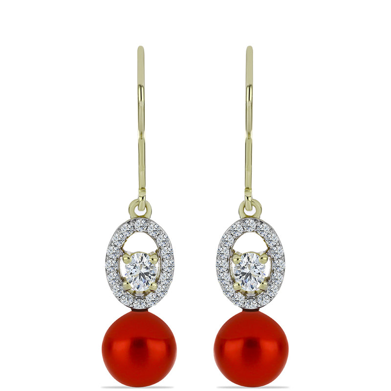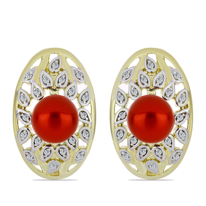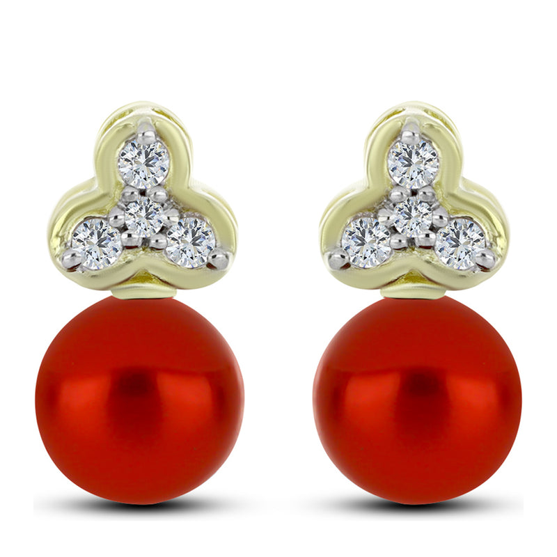 Pozlacené Stříbrné Náušnice s Červená sladkovodní Perlou a Bílým Topazem