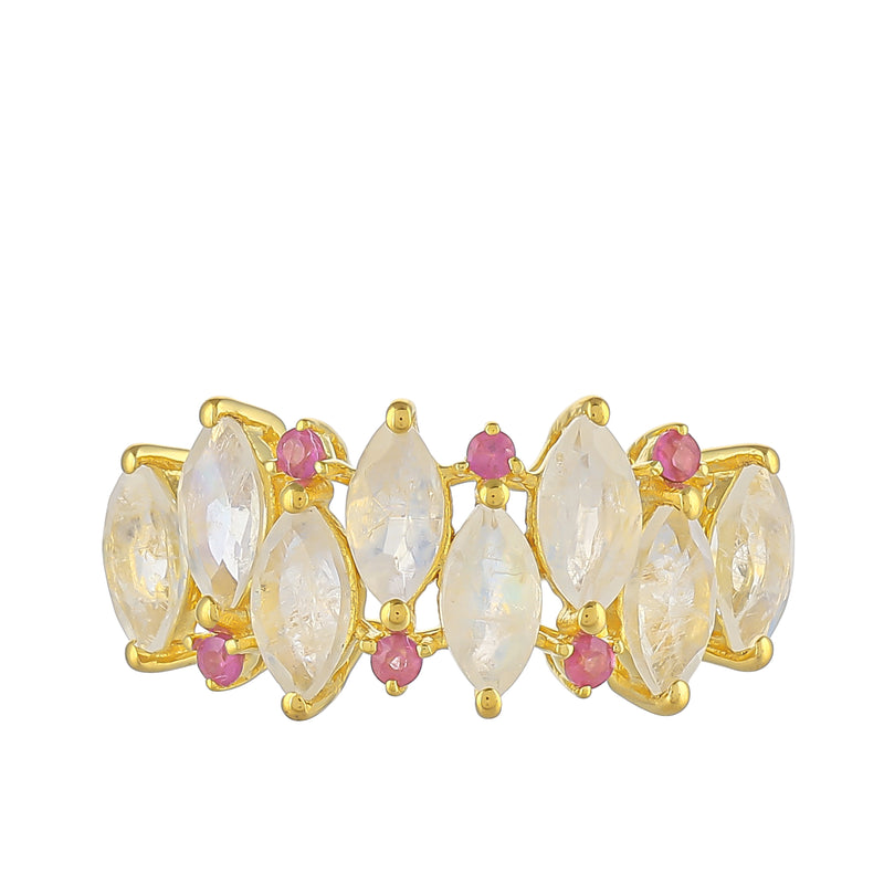 Pozlacený Stříbrný Prsten s Duhovým Měsíčním Kamenem a Thajským Rubínem