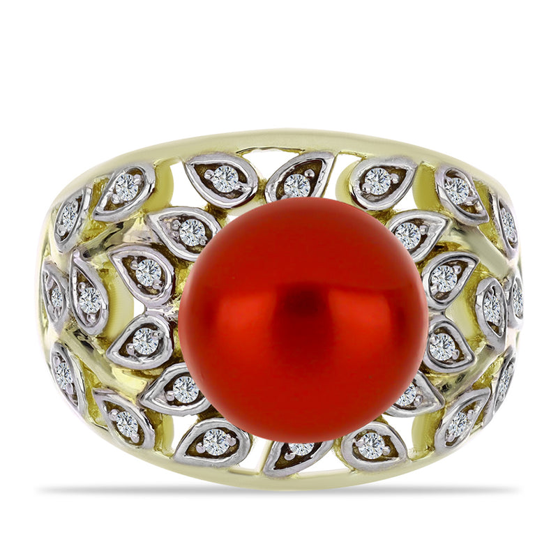 Pozlacený Stříbrný Prsten s Červená sladkovodní Perlou a Bílým Topazem