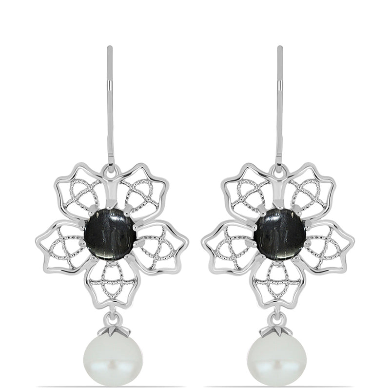 Stříbro 925/1000 Náušnice s Picasso Jaspisem a Bílou Sladkovodní Perlou - Karátové číslo: 10.04. přibližná hmotnost: 6.53 gramů